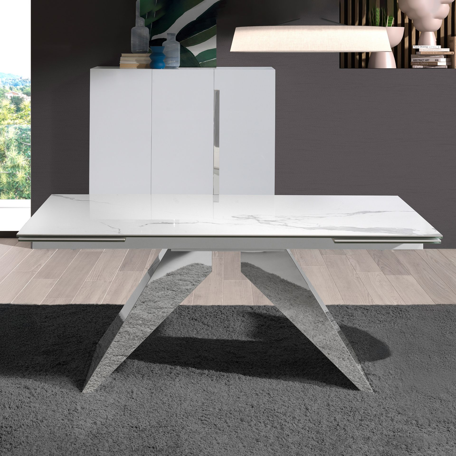 Masă extensibilă dreptunghiulară cu design modern, cu blat din marmură porțelanată albă cu vene gri, finisaj lucios. Picioarele din oțel inoxidabil cromat și adaptabilitatea sa o fac o piesă de mobilier complet funcțională și versatilă pentru uzul zilnic. Această masă are 2 extensii de 40 cm, putând fi extinsă de la 160 la 240 cm.