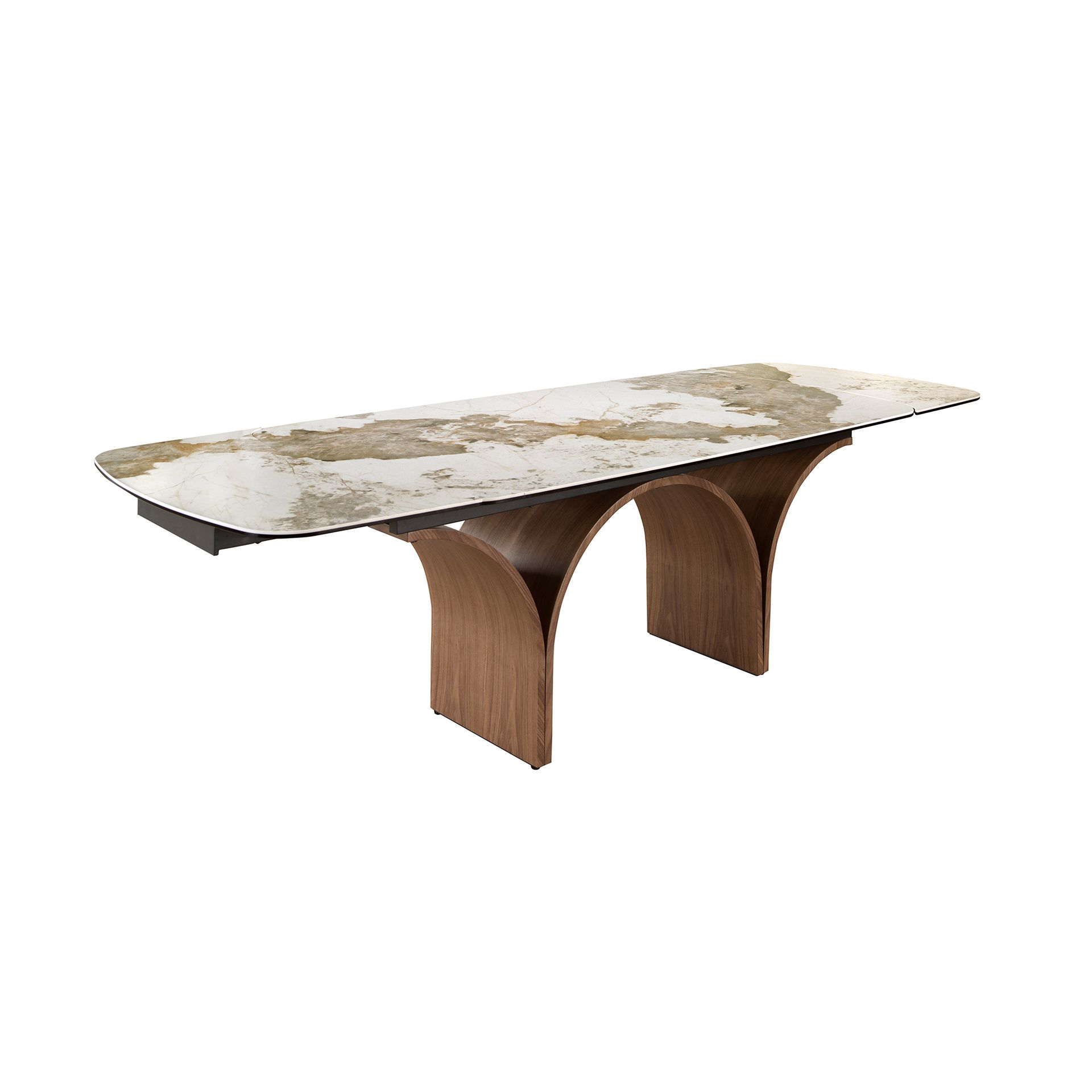 Masă extensibilă dreptunghiulară cu design modern, cu blat din marmură albă din porțelan și vene în nuanțe de pământ, cu finisaj lucios. Picioarele din oțel inoxidabil lăcuit, care imită lemnul de nuc, și adaptabilitatea sa o fac o piesă de mobilier complet funcțională și versatilă pentru uzul zilnic. Această masă are 2 extensii de 40 cm, putând fi extinsă de la 180 la 260 cm.