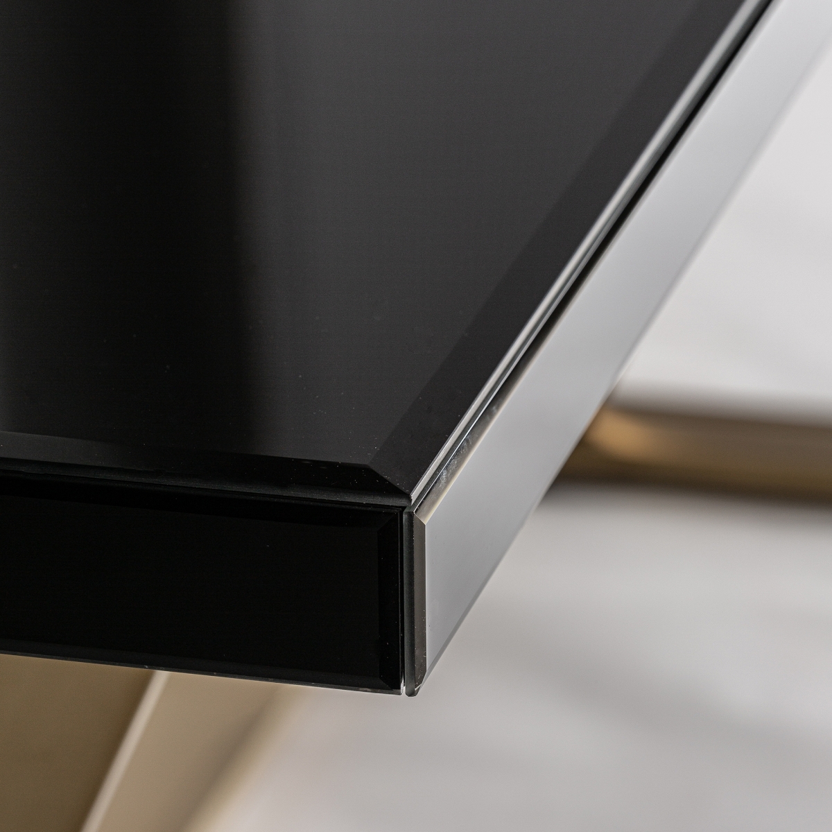 Masă dining cu picioare aurii din fier. Blat din sticlă neagra.