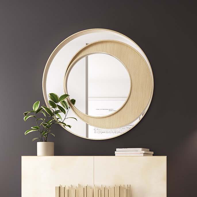 Oglinda de perete inspirata dintr-o geometrie placuta din punct de vedere estetic, cu un cadru metalic cald cu finisaj auriu vintage si un interior cu finisaj stejar. Rama aduce un punct focal atrăgător oricărei camere de zi, dormitor, intrare, sufragerie sau baie. Produs premium confectionat la comanda, termen de executie 8 saptamani.
